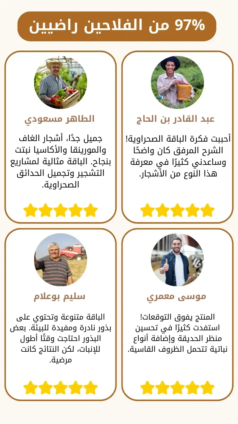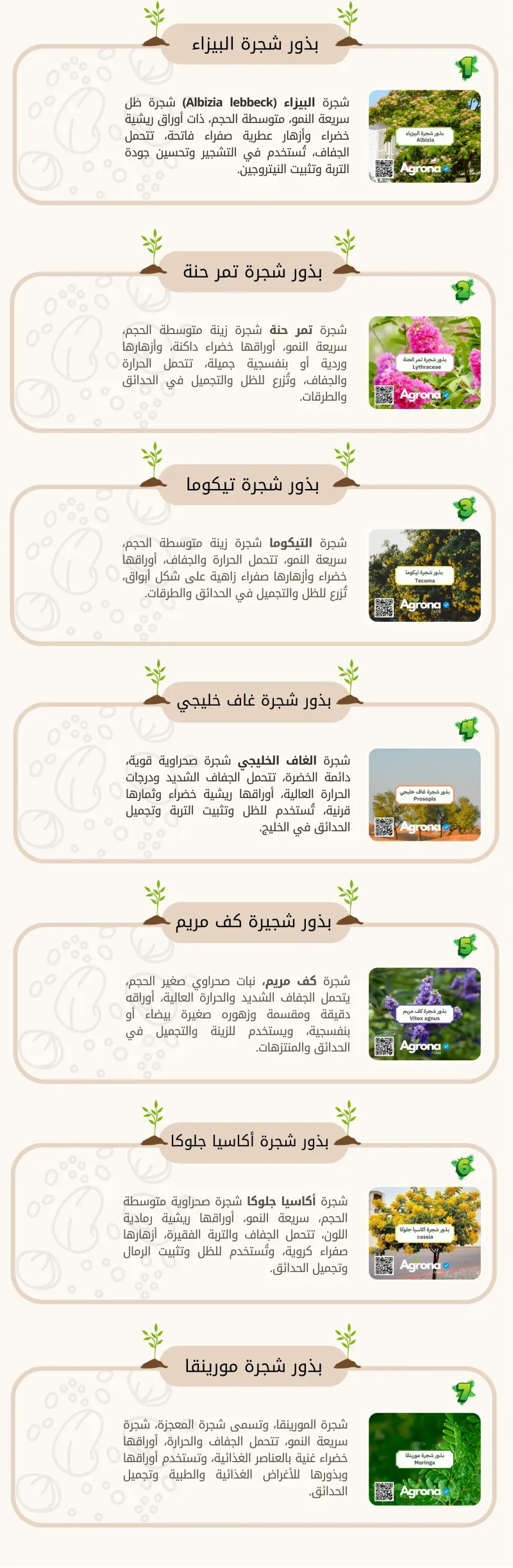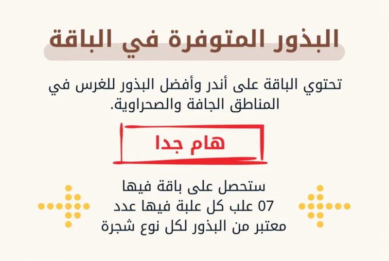 🌵 باقة الأشجار الصحراوية المقاومة – خُضرة تدوم في قلب الصحراء! 🌞 حوّل مساحتك الخارجية إلى واحة نابضة بالحياة مع باقة مميزة من 7 أشجار صحراوية مختارة بعناية، تتحمل أقسى الظروف وتجمع بين الجمال، التحمل، وسهولة العناية. مثالية للحدائق المنزلية، المشاريع البيئية، أو تنسيق الحدائق العامة.